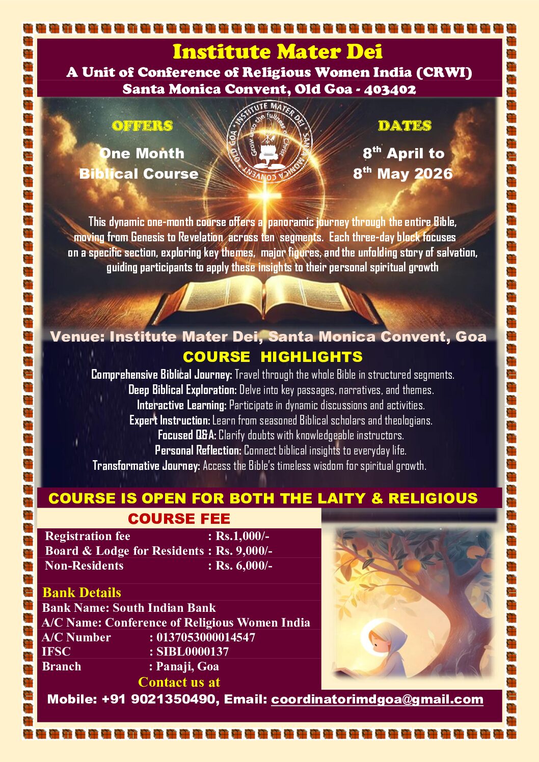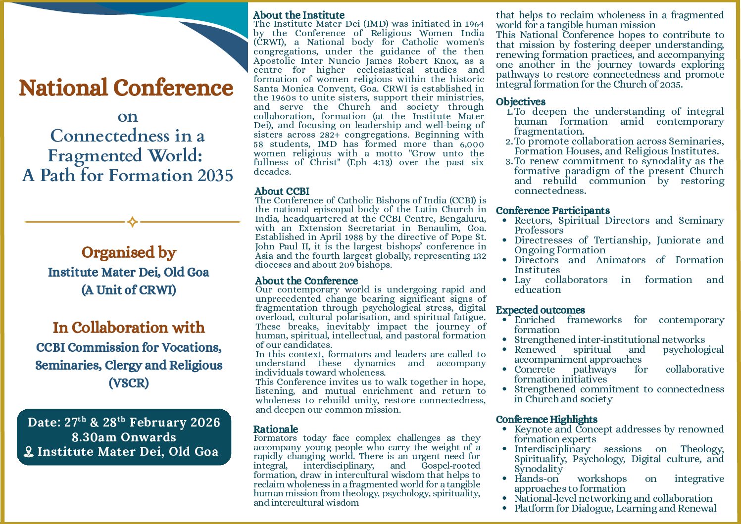Institute Mater Dei, Old Goa, a unit of the Conference of Religious Women India (CRWI), in collaboration with the CCBI Commission for Vocations, Seminaries, Clergy and Religious (VSCR), is pleased to announce a National Conference titled “Connectedness in a Fragmented World: A Path for Formation 2035.” The conference will be held on 27–28 February 2026 at Institute Mater Dei, Old Goa.